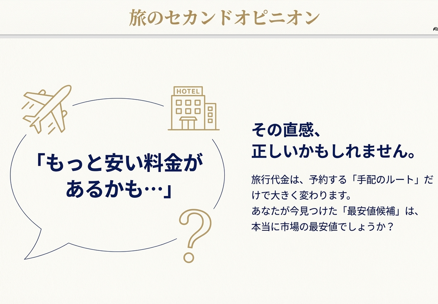 - ✔ 「漠然とした旅行相談」は対象外。具体的な見積もりの見直しに特化
